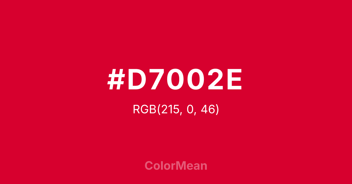 #D7002E RGB value is (215, 0, 46). The hex color red value is 215, green is 0, and blue is 46. Its HSL format shows a hue of 347°, saturation of 100 percent, and lightness of 42 percent. The CMYK process values are 0 percent, 100 percent, 79 percent, 16 percent.