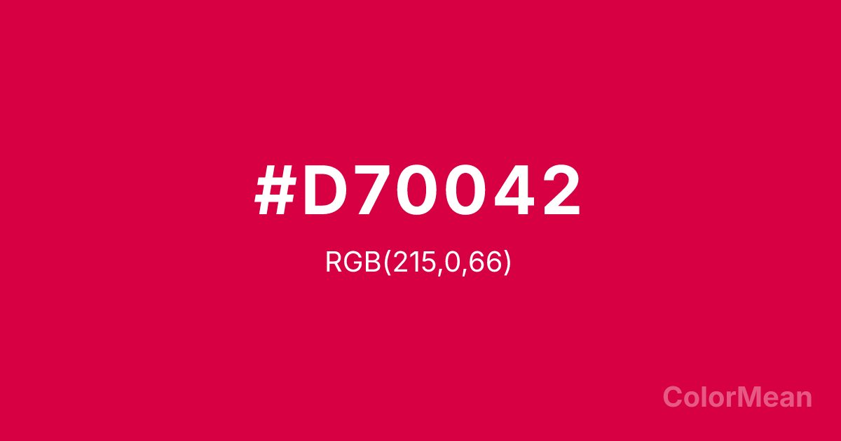 #D70042 RGB value is (215, 0, 66). The hex color red value is 215, green is 0, and blue is 66. Its HSL format shows a hue of 342°, saturation of 100 percent, and lightness of 42 percent. The CMYK process values are 0 percent, 100 percent, 69 percent, 16 percent.