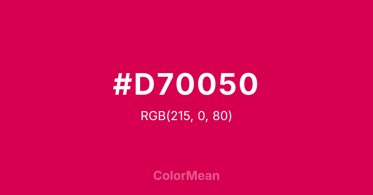 #D70050 RGB value is (215, 0, 80). The hex color red value is 215, green is 0, and blue is 80. Its HSL format shows a hue of 338°, saturation of 100 percent, and lightness of 42 percent. The CMYK process values are 0 percent, 100 percent, 63 percent, 16 percent.