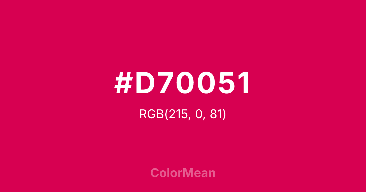 #D70051 RGB value is (215, 0, 81). The hex color red value is 215, green is 0, and blue is 81. Its HSL format shows a hue of 337°, saturation of 100 percent, and lightness of 42 percent. The CMYK process values are 0 percent, 100 percent, 62 percent, 16 percent.
