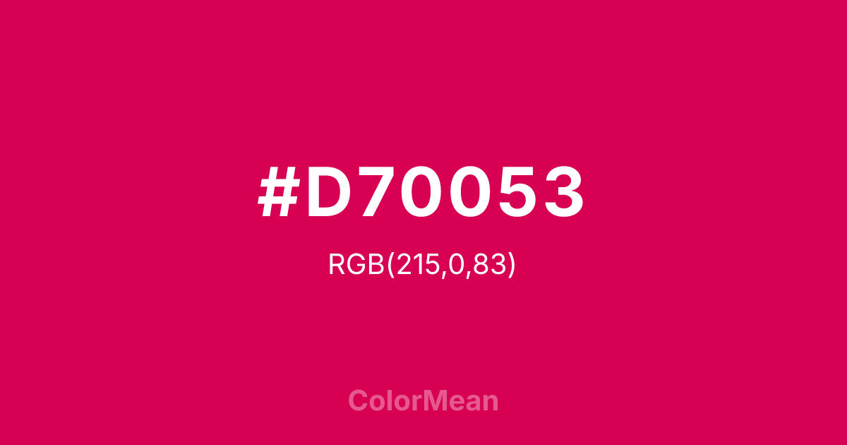 #D70053 RGB value is (215, 0, 83). The hex color red value is 215, green is 0, and blue is 83. Its HSL format shows a hue of 337°, saturation of 100 percent, and lightness of 42 percent. The CMYK process values are 0 percent, 100 percent, 61 percent, 16 percent.