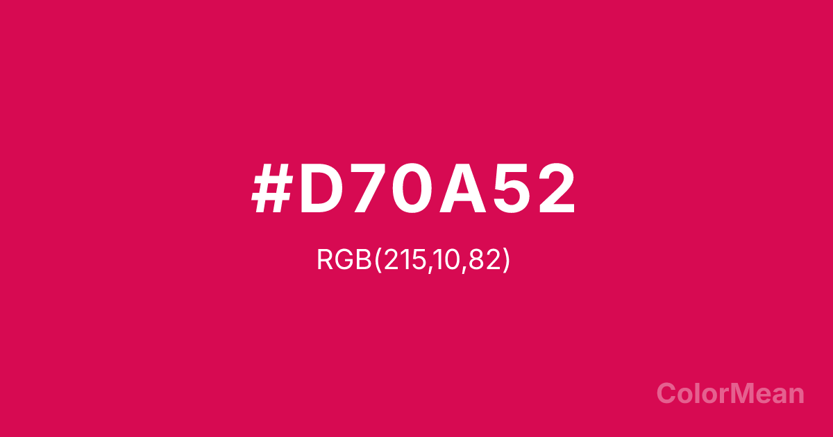 #D70A52 RGB value is (215, 10, 82). The hex color red value is 215, green is 10, and blue is 82. Its HSL format shows a hue of 339°, saturation of 91 percent, and lightness of 44 percent. The CMYK process values are 0 percent, 95 percent, 62 percent, 16 percent.