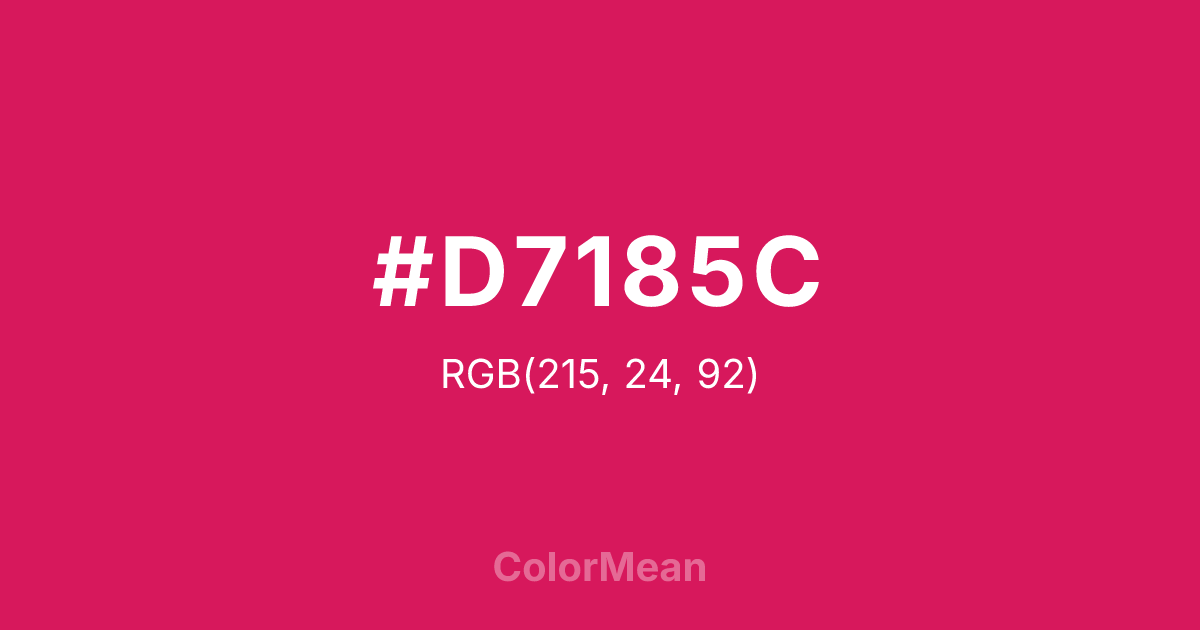 #D7185C RGB value is (215, 24, 92). The hex color red value is 215, green is 24, and blue is 92. Its HSL format shows a hue of 339°, saturation of 80 percent, and lightness of 47 percent. The CMYK process values are 0 percent, 89 percent, 57 percent, 16 percent.