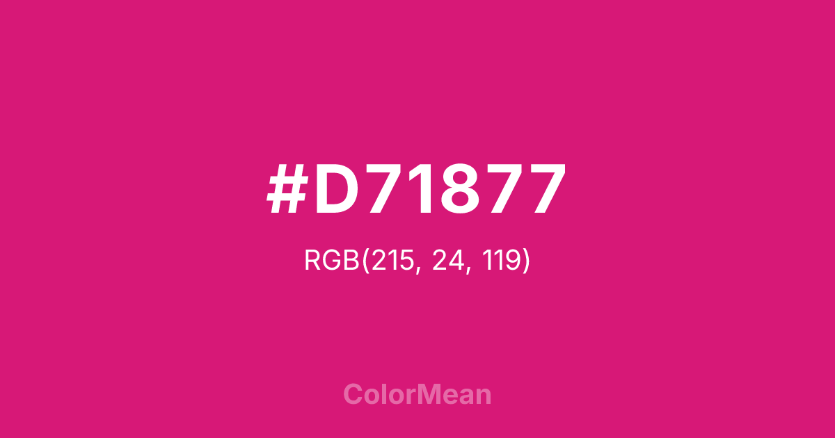 #D71877 RGB value is (215, 24, 119). The hex color red value is 215, green is 24, and blue is 119. Its HSL format shows a hue of 330°, saturation of 80 percent, and lightness of 47 percent. The CMYK process values are 0 percent, 89 percent, 45 percent, 16 percent.