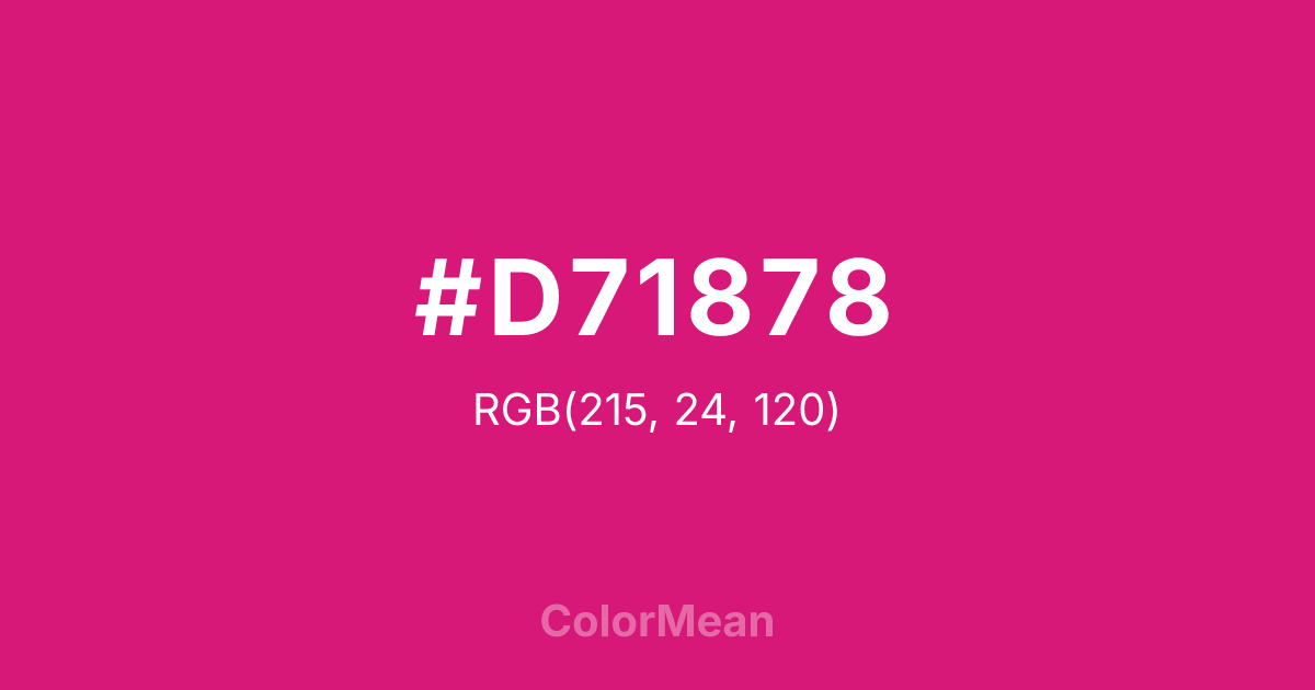 #D71878 RGB value is (215, 24, 120). The hex color red value is 215, green is 24, and blue is 120. Its HSL format shows a hue of 330°, saturation of 80 percent, and lightness of 47 percent. The CMYK process values are 0 percent, 89 percent, 44 percent, 16 percent.