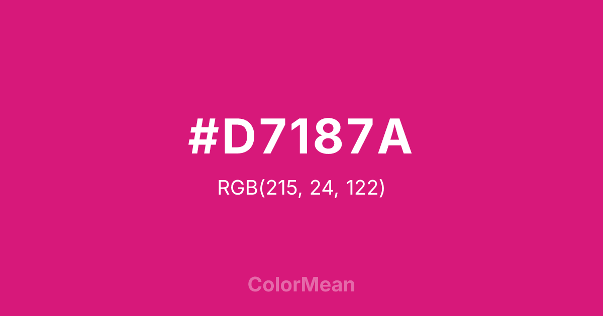 #D7187A RGB value is (215, 24, 122). The hex color red value is 215, green is 24, and blue is 122. Its HSL format shows a hue of 329°, saturation of 80 percent, and lightness of 47 percent. The CMYK process values are 0 percent, 89 percent, 43 percent, 16 percent.