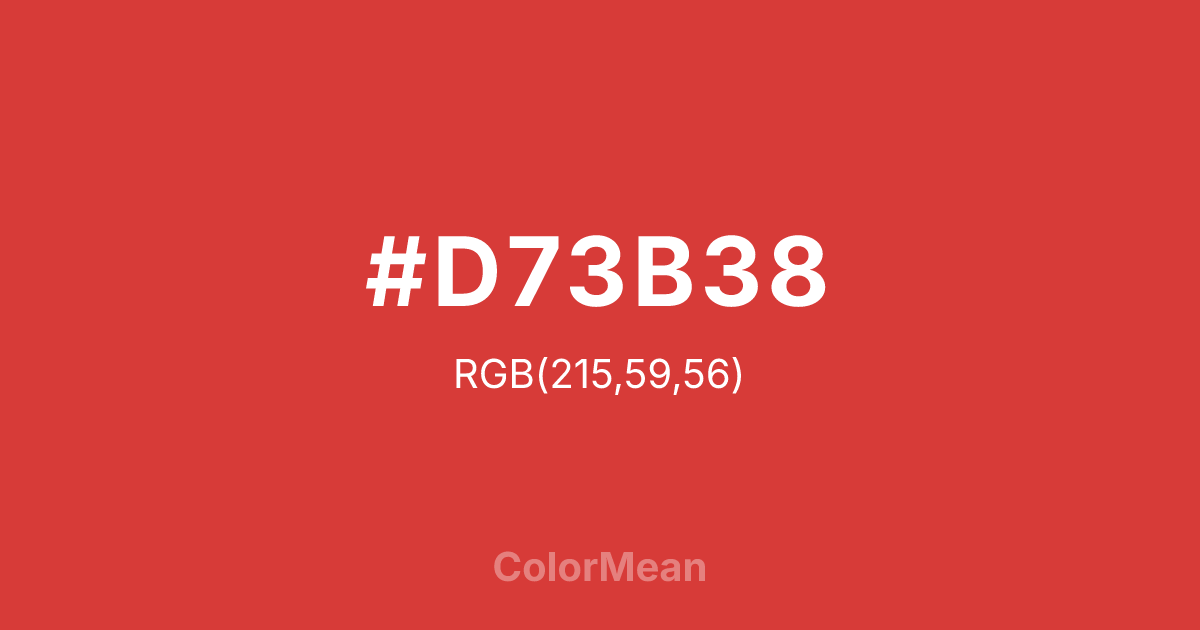 #D73B38 RGB value is (215, 59, 56). The hex color red value is 215, green is 59, and blue is 56. Its HSL format shows a hue of 1°, saturation of 67 percent, and lightness of 53 percent. The CMYK process values are 0 percent, 73 percent, 74 percent, 16 percent.