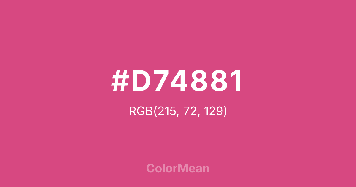 #D74881 RGB value is (215, 72, 129). The hex color red value is 215, green is 72, and blue is 129. Its HSL format shows a hue of 336°, saturation of 64 percent, and lightness of 56 percent. The CMYK process values are 0 percent, 67 percent, 40 percent, 16 percent.