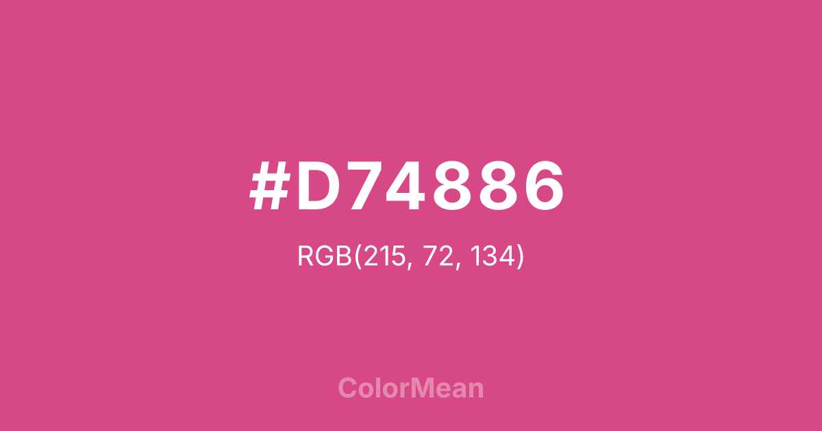 #D74886 RGB value is (215, 72, 134). The hex color red value is 215, green is 72, and blue is 134. Its HSL format shows a hue of 334°, saturation of 64 percent, and lightness of 56 percent. The CMYK process values are 0 percent, 67 percent, 38 percent, 16 percent.