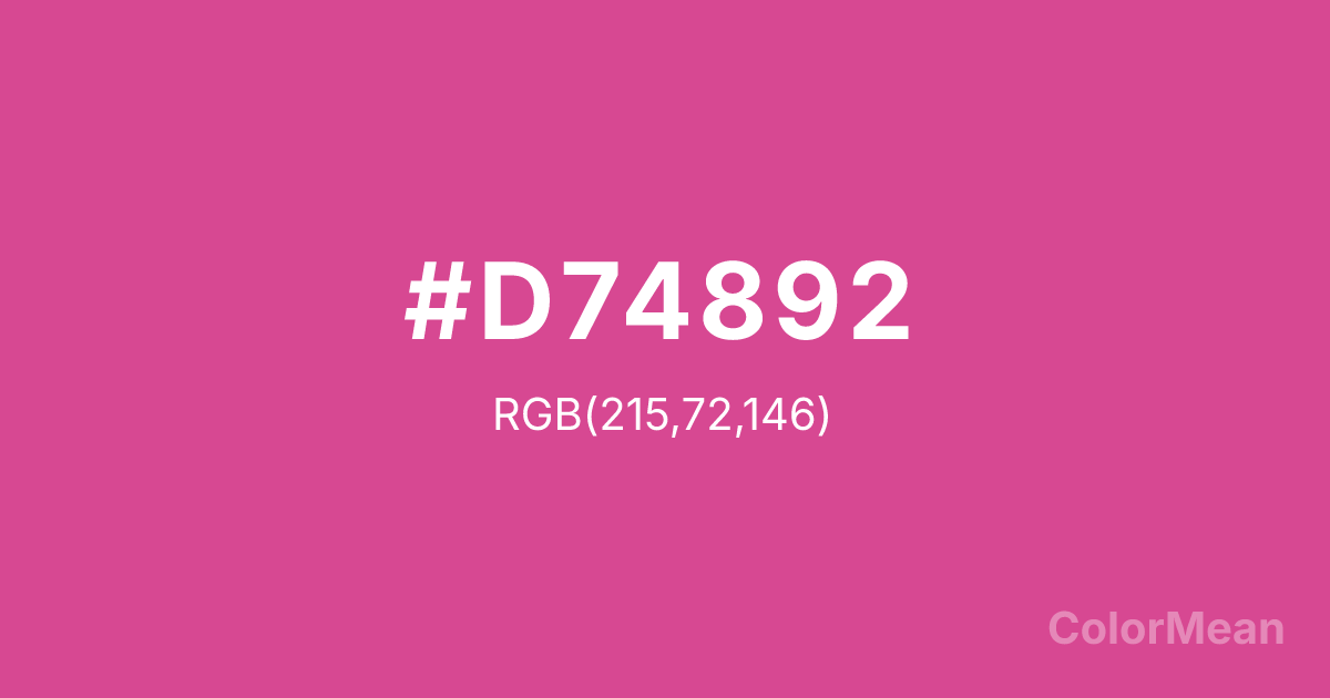 #D74892 RGB value is (215, 72, 146). The hex color red value is 215, green is 72, and blue is 146. Its HSL format shows a hue of 329°, saturation of 64 percent, and lightness of 56 percent. The CMYK process values are 0 percent, 67 percent, 32 percent, 16 percent.