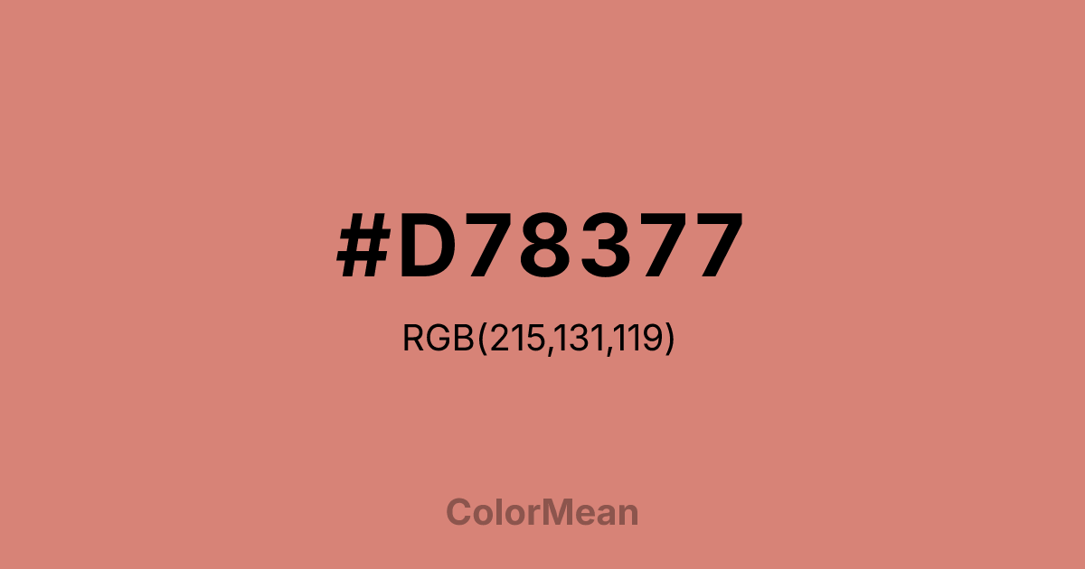 #D78377 RGB value is (215, 131, 119). The hex color red value is 215, green is 131, and blue is 119. Its HSL format shows a hue of 7°, saturation of 55 percent, and lightness of 65 percent. The CMYK process values are 0 percent, 39 percent, 45 percent, 16 percent.