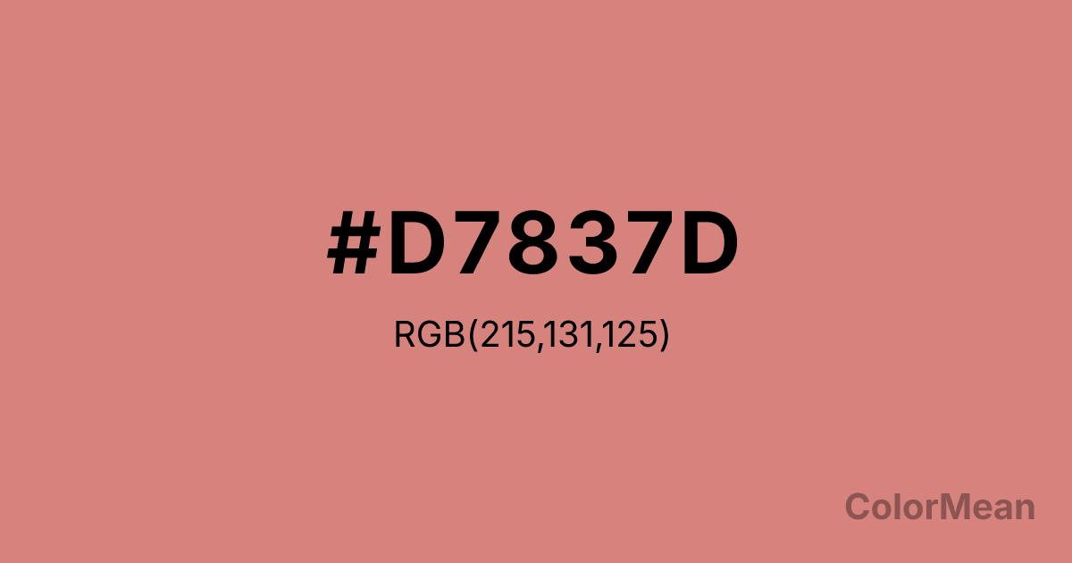#D7837D RGB value is (215, 131, 125). The hex color red value is 215, green is 131, and blue is 125. Its HSL format shows a hue of 4°, saturation of 53 percent, and lightness of 67 percent. The CMYK process values are 0 percent, 39 percent, 42 percent, 16 percent.