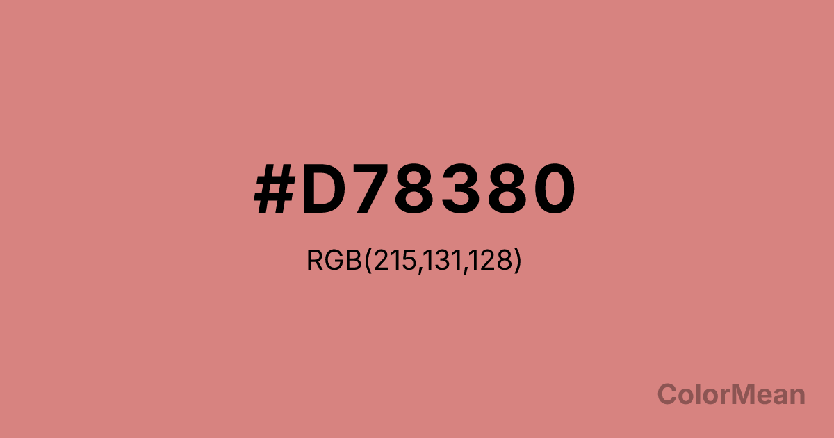 #D78380 RGB value is (215, 131, 128). The hex color red value is 215, green is 131, and blue is 128. Its HSL format shows a hue of 2°, saturation of 52 percent, and lightness of 67 percent. The CMYK process values are 0 percent, 39 percent, 40 percent, 16 percent.