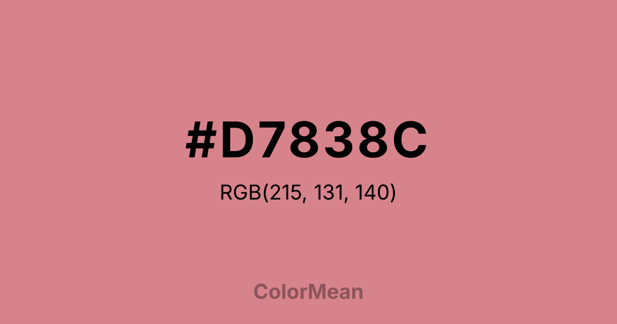 #D7838C RGB value is (215, 131, 140). The hex color red value is 215, green is 131, and blue is 140. Its HSL format shows a hue of 354°, saturation of 51 percent, and lightness of 68 percent. The CMYK process values are 0 percent, 39 percent, 35 percent, 16 percent.