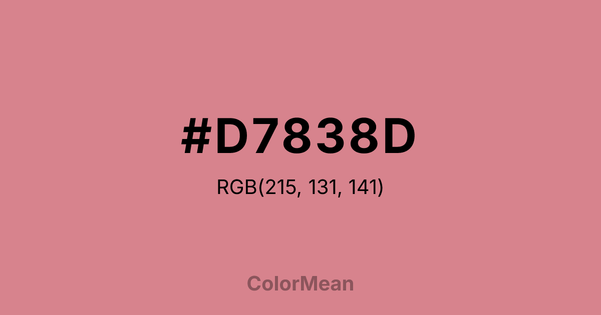 #D7838D RGB value is (215, 131, 141). The hex color red value is 215, green is 131, and blue is 141. Its HSL format shows a hue of 353°, saturation of 51 percent, and lightness of 68 percent. The CMYK process values are 0 percent, 39 percent, 34 percent, 16 percent.