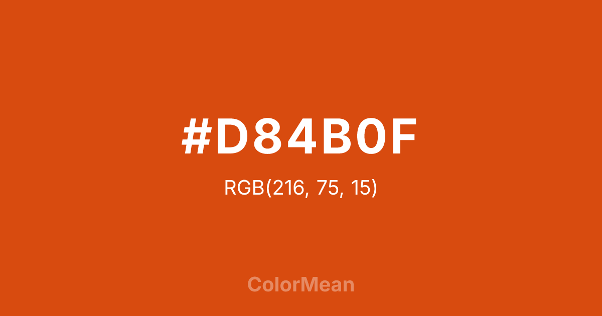 #D84B0F RGB value is (216, 75, 15). The hex color red value is 216, green is 75, and blue is 15. Its HSL format shows a hue of 18°, saturation of 87 percent, and lightness of 45 percent. The CMYK process values are 0 percent, 65 percent, 93 percent, 15 percent.