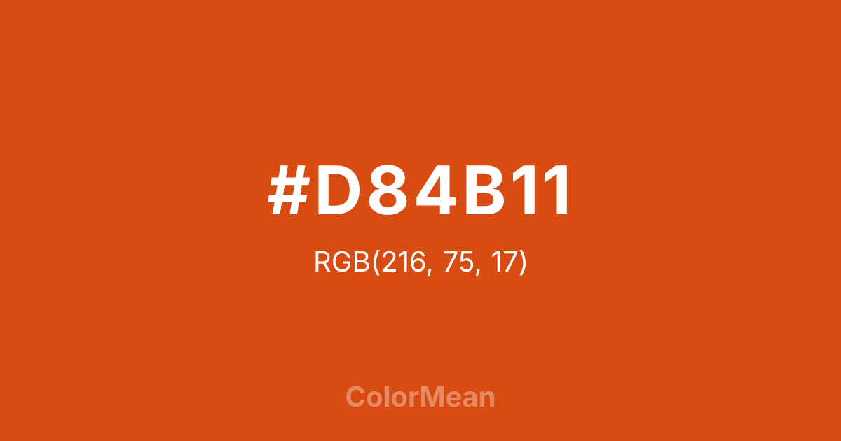 #D84B11 RGB value is (216, 75, 17). The hex color red value is 216, green is 75, and blue is 17. Its HSL format shows a hue of 17°, saturation of 85 percent, and lightness of 46 percent. The CMYK process values are 0 percent, 65 percent, 92 percent, 15 percent.