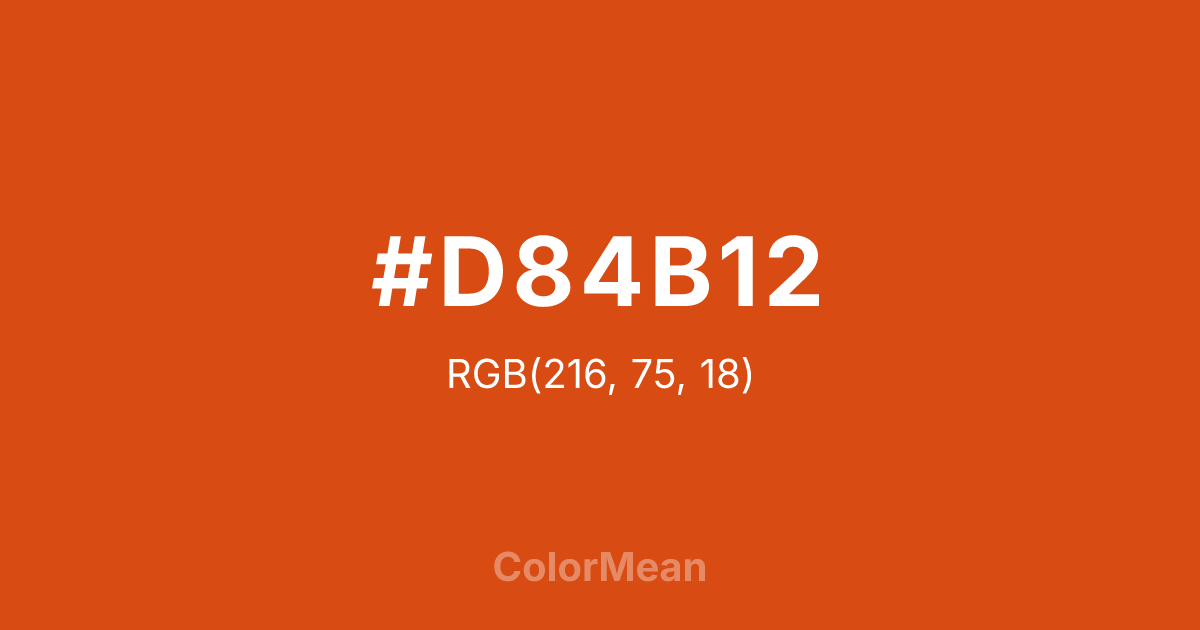 #D84B12 RGB value is (216, 75, 18). The hex color red value is 216, green is 75, and blue is 18. Its HSL format shows a hue of 17°, saturation of 85 percent, and lightness of 46 percent. The CMYK process values are 0 percent, 65 percent, 92 percent, 15 percent.