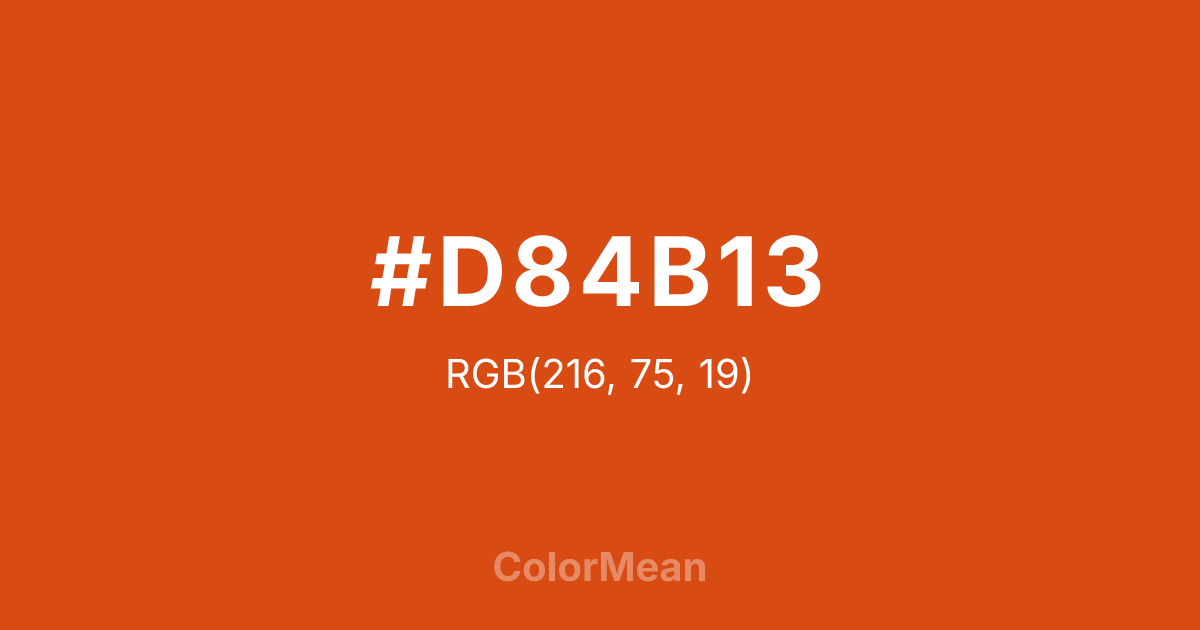 #D84B13 RGB value is (216, 75, 19). The hex color red value is 216, green is 75, and blue is 19. Its HSL format shows a hue of 17°, saturation of 84 percent, and lightness of 46 percent. The CMYK process values are 0 percent, 65 percent, 91 percent, 15 percent.