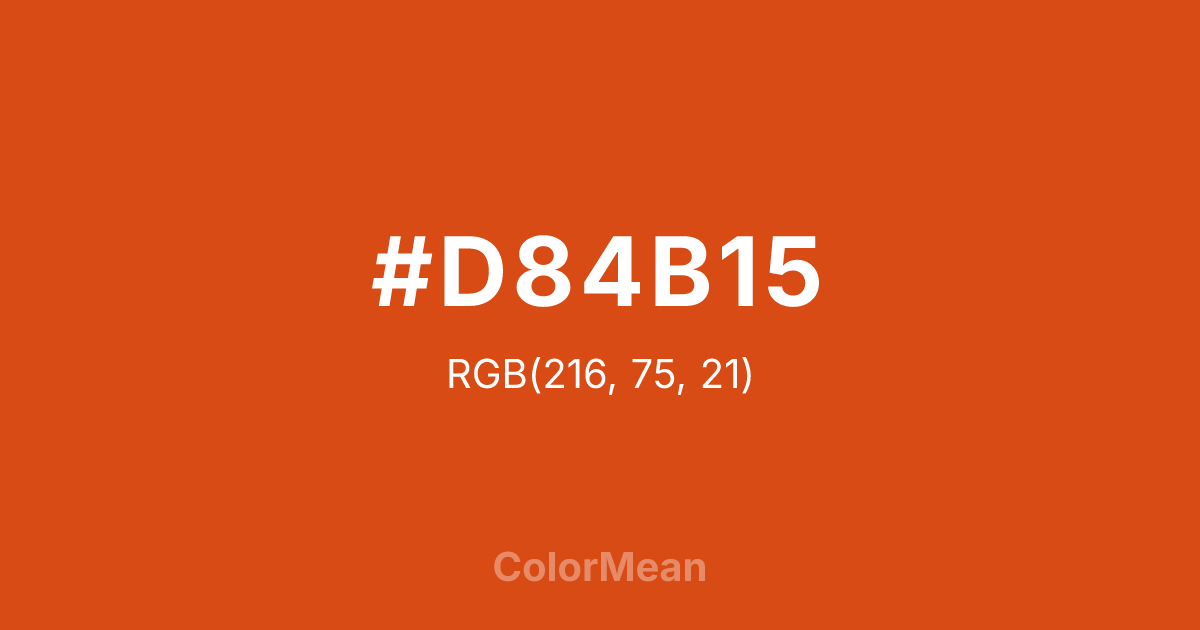#D84B15 RGB value is (216, 75, 21). The hex color red value is 216, green is 75, and blue is 21. Its HSL format shows a hue of 17°, saturation of 82 percent, and lightness of 46 percent. The CMYK process values are 0 percent, 65 percent, 90 percent, 15 percent.