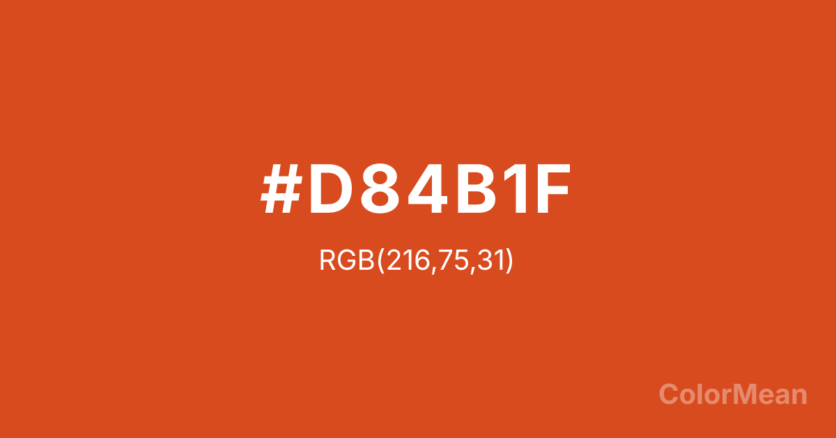 #D84B1F RGB value is (216, 75, 31). The hex color red value is 216, green is 75, and blue is 31. Its HSL format shows a hue of 14°, saturation of 75 percent, and lightness of 48 percent. The CMYK process values are 0 percent, 65 percent, 86 percent, 15 percent.