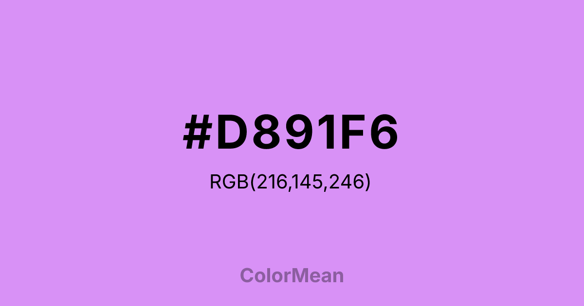 #D891F6 RGB value is (216, 145, 246). The hex color red value is 216, green is 145, and blue is 246. Its HSL format shows a hue of 282°, saturation of 85 percent, and lightness of 77 percent. The CMYK process values are 12 percent, 41 percent, 0 percent, 4 percent.