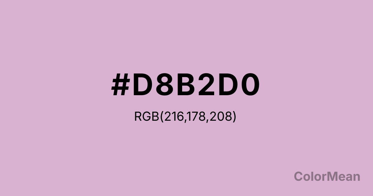 #D8B2D0 RGB value is (216, 178, 208). The hex color red value is 216, green is 178, and blue is 208. Its HSL format shows a hue of 313°, saturation of 33 percent, and lightness of 77 percent. The CMYK process values are 0 percent, 18 percent, 4 percent, 15 percent.
