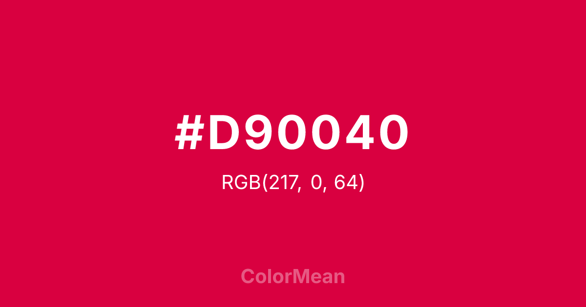 #D90040 RGB value is (217, 0, 64). The hex color red value is 217, green is 0, and blue is 64. Its HSL format shows a hue of 342°, saturation of 100 percent, and lightness of 43 percent. The CMYK process values are 0 percent, 100 percent, 71 percent, 15 percent.