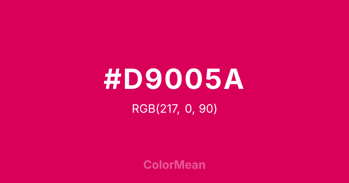 #D9005A RGB value is (217, 0, 90). The hex color red value is 217, green is 0, and blue is 90. Its HSL format shows a hue of 335°, saturation of 100 percent, and lightness of 43 percent. The CMYK process values are 0 percent, 100 percent, 59 percent, 15 percent.