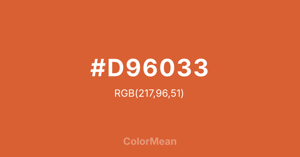 #D96033 RGB value is (217, 96, 51). The hex color red value is 217, green is 96, and blue is 51. Its HSL format shows a hue of 16°, saturation of 69 percent, and lightness of 53 percent. The CMYK process values are 0 percent, 56 percent, 76 percent, 15 percent.