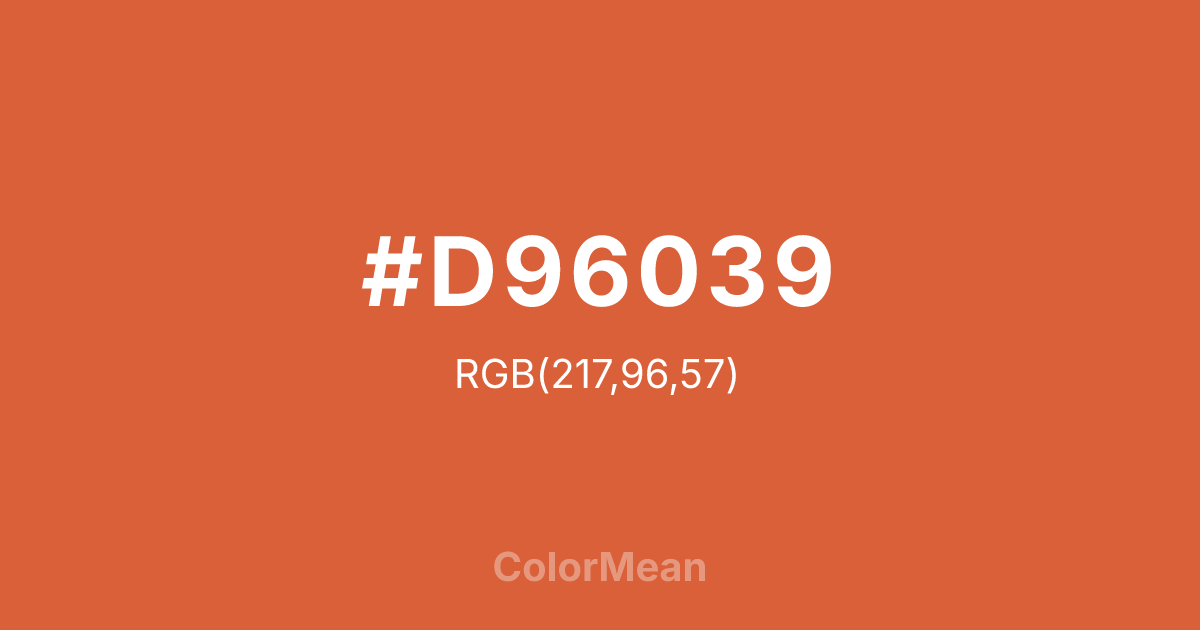 #D96039 RGB value is (217, 96, 57). The hex color red value is 217, green is 96, and blue is 57. Its HSL format shows a hue of 15°, saturation of 68 percent, and lightness of 54 percent. The CMYK process values are 0 percent, 56 percent, 74 percent, 15 percent.