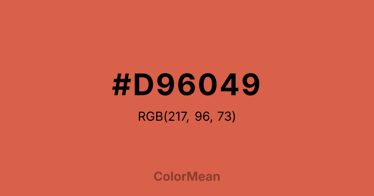#D96049 RGB value is (217, 96, 73). The hex color red value is 217, green is 96, and blue is 73. Its HSL format shows a hue of 10°, saturation of 65 percent, and lightness of 57 percent. The CMYK process values are 0 percent, 56 percent, 66 percent, 15 percent.