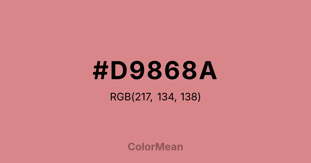 #D9868A RGB value is (217, 134, 138). The hex color red value is 217, green is 134, and blue is 138. Its HSL format shows a hue of 357°, saturation of 52 percent, and lightness of 69 percent. The CMYK process values are 0 percent, 38 percent, 36 percent, 15 percent.
