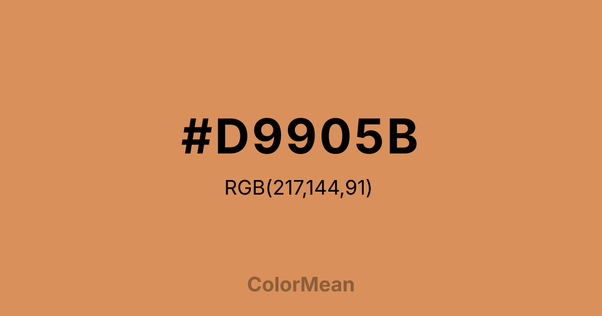 #D9905B RGB value is (217, 144, 91). The hex color red value is 217, green is 144, and blue is 91. Its HSL format shows a hue of 25°, saturation of 62 percent, and lightness of 60 percent. The CMYK process values are 0 percent, 34 percent, 58 percent, 15 percent.