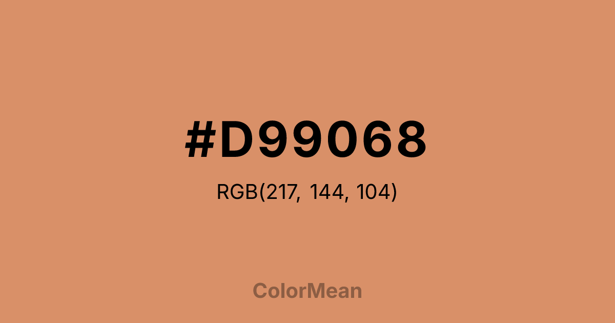 #D99068 RGB value is (217, 144, 104). The hex color red value is 217, green is 144, and blue is 104. Its HSL format shows a hue of 21°, saturation of 60 percent, and lightness of 63 percent. The CMYK process values are 0 percent, 34 percent, 52 percent, 15 percent.