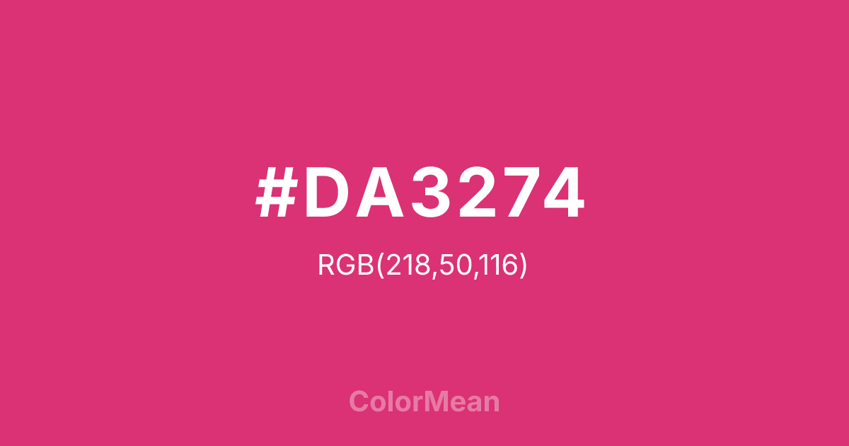 #DA3274 RGB value is (218, 50, 116). The hex color red value is 218, green is 50, and blue is 116. Its HSL format shows a hue of 336°, saturation of 69 percent, and lightness of 53 percent. The CMYK process values are 0 percent, 77 percent, 47 percent, 15 percent.