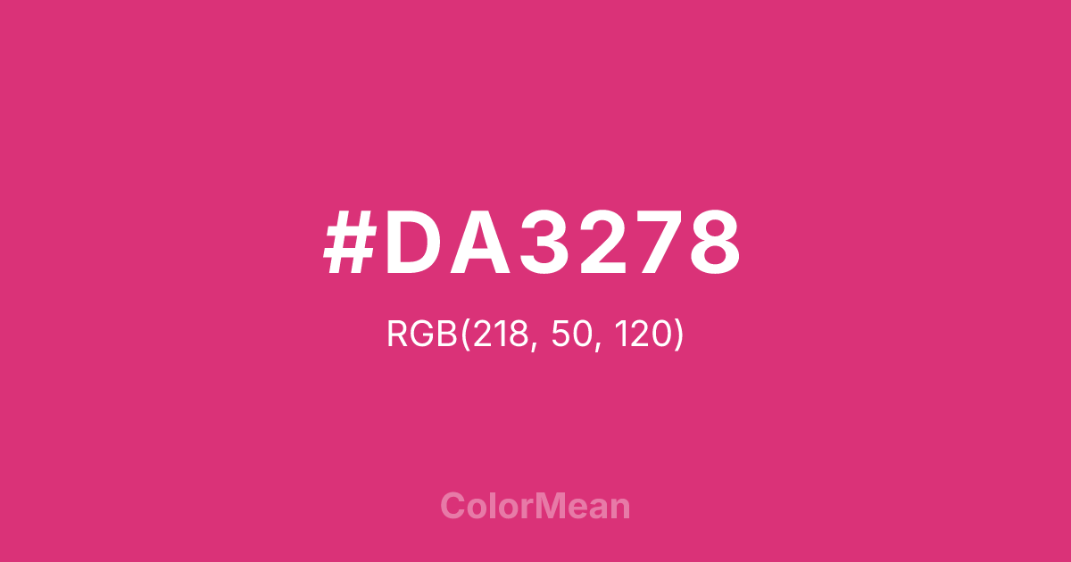 #DA3278 RGB value is (218, 50, 120). The hex color red value is 218, green is 50, and blue is 120. Its HSL format shows a hue of 335°, saturation of 69 percent, and lightness of 53 percent. The CMYK process values are 0 percent, 77 percent, 45 percent, 15 percent.