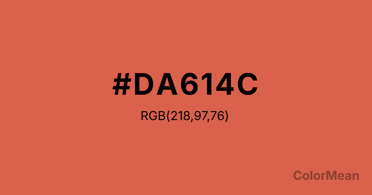 #DA614C RGB value is (218, 97, 76). The hex color red value is 218, green is 97, and blue is 76. Its HSL format shows a hue of 9°, saturation of 66 percent, and lightness of 58 percent. The CMYK process values are 0 percent, 56 percent, 65 percent, 15 percent.