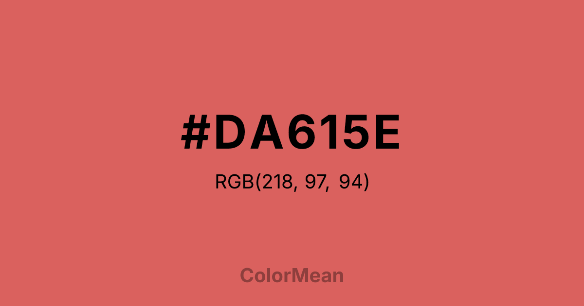#DA615E RGB value is (218, 97, 94). The hex color red value is 218, green is 97, and blue is 94. Its HSL format shows a hue of 1°, saturation of 63 percent, and lightness of 61 percent. The CMYK process values are 0 percent, 56 percent, 57 percent, 15 percent.