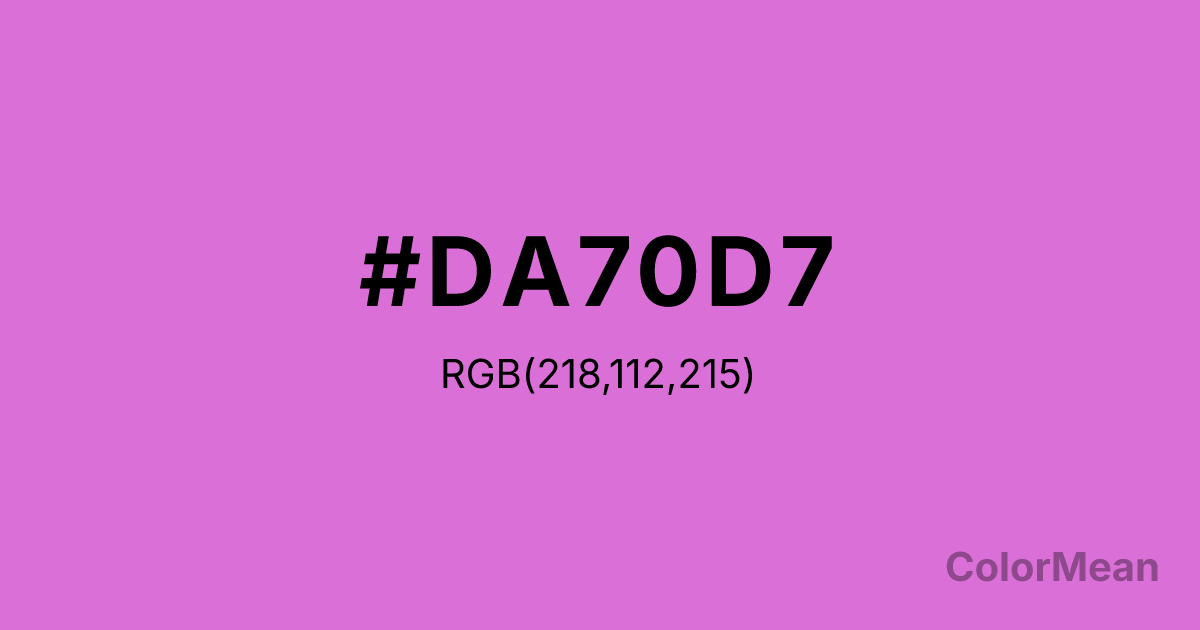 #DA70D7 RGB value is (218, 112, 215). The hex color red value is 218, green is 112, and blue is 215. Its HSL format shows a hue of 302°, saturation of 59 percent, and lightness of 65 percent. The CMYK process values are 0 percent, 49 percent, 1 percent, 15 percent.