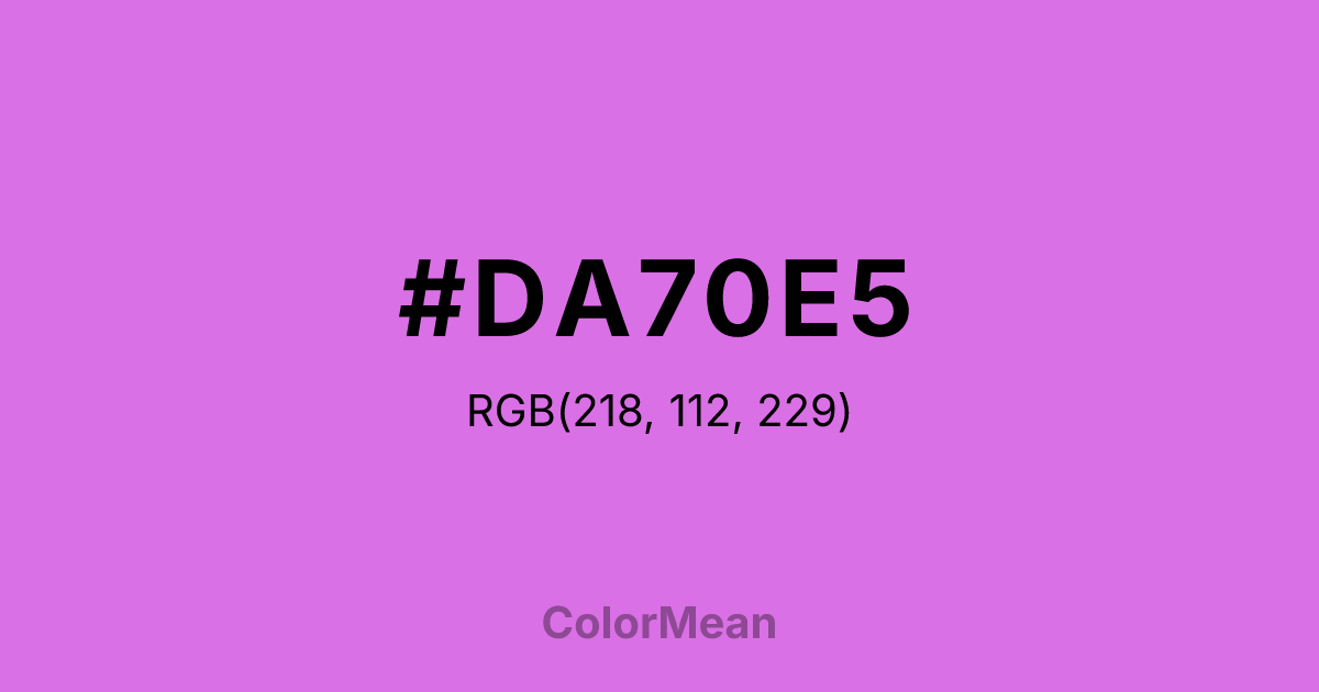 #DA70E5 RGB value is (218, 112, 229). The hex color red value is 218, green is 112, and blue is 229. Its HSL format shows a hue of 294°, saturation of 69 percent, and lightness of 67 percent. The CMYK process values are 5 percent, 51 percent, 0 percent, 10 percent.