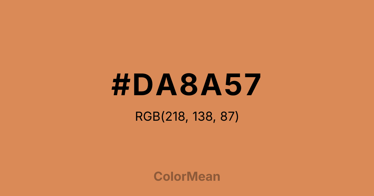 #DA8A57 RGB value is (218, 138, 87). The hex color red value is 218, green is 138, and blue is 87. Its HSL format shows a hue of 23°, saturation of 64 percent, and lightness of 60 percent. The CMYK process values are 0 percent, 37 percent, 60 percent, 15 percent.