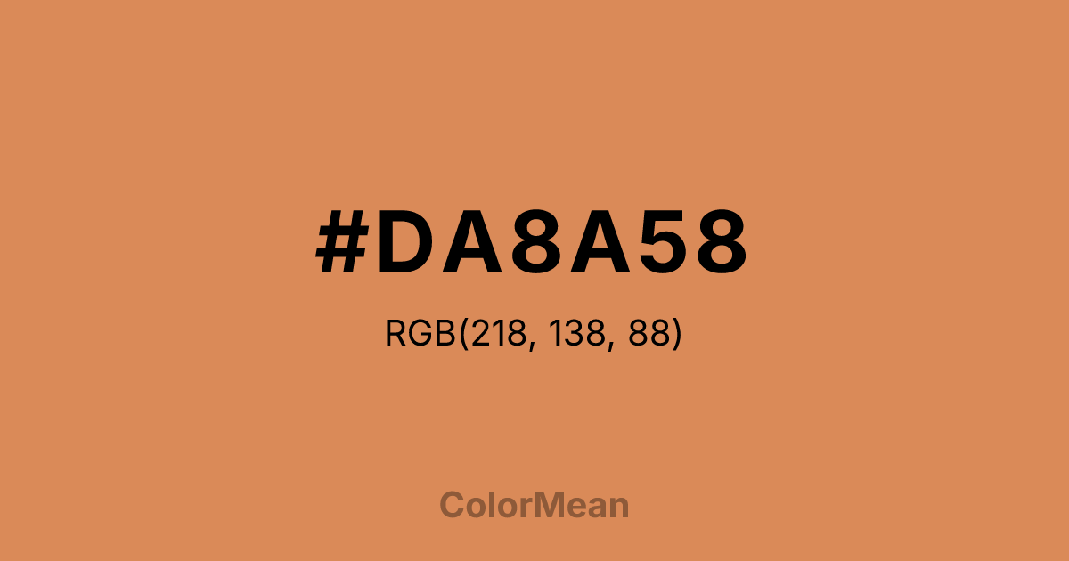 #DA8A58 RGB value is (218, 138, 88). The hex color red value is 218, green is 138, and blue is 88. Its HSL format shows a hue of 23°, saturation of 64 percent, and lightness of 60 percent. The CMYK process values are 0 percent, 37 percent, 60 percent, 15 percent.