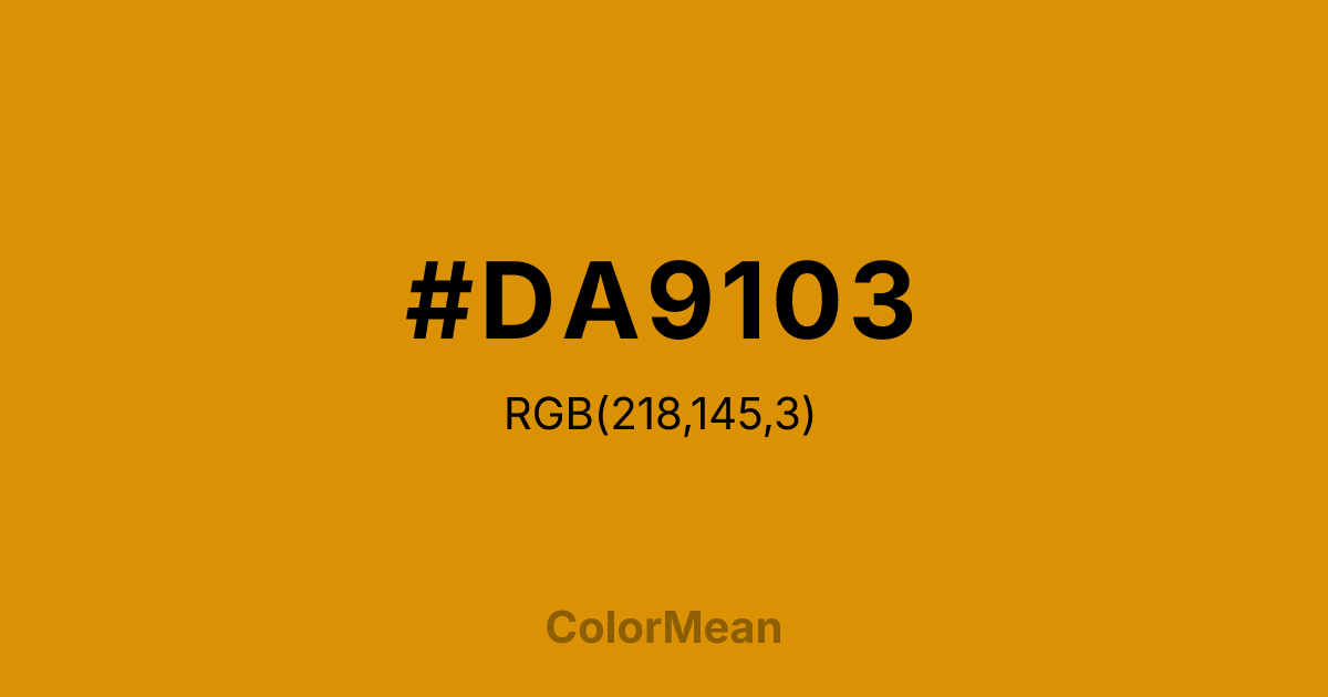 #DA9103 RGB value is (218, 145, 3). The hex color red value is 218, green is 145, and blue is 3. Its HSL format shows a hue of 40°, saturation of 97 percent, and lightness of 43 percent. The CMYK process values are 0 percent, 33 percent, 99 percent, 15 percent.