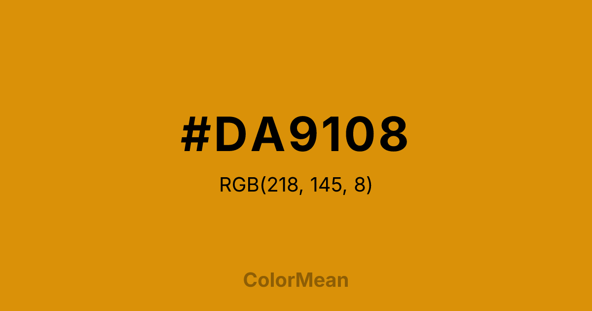 #DA9108 RGB value is (218, 145, 8). The hex color red value is 218, green is 145, and blue is 8. Its HSL format shows a hue of 39°, saturation of 93 percent, and lightness of 44 percent. The CMYK process values are 0 percent, 33 percent, 96 percent, 15 percent.