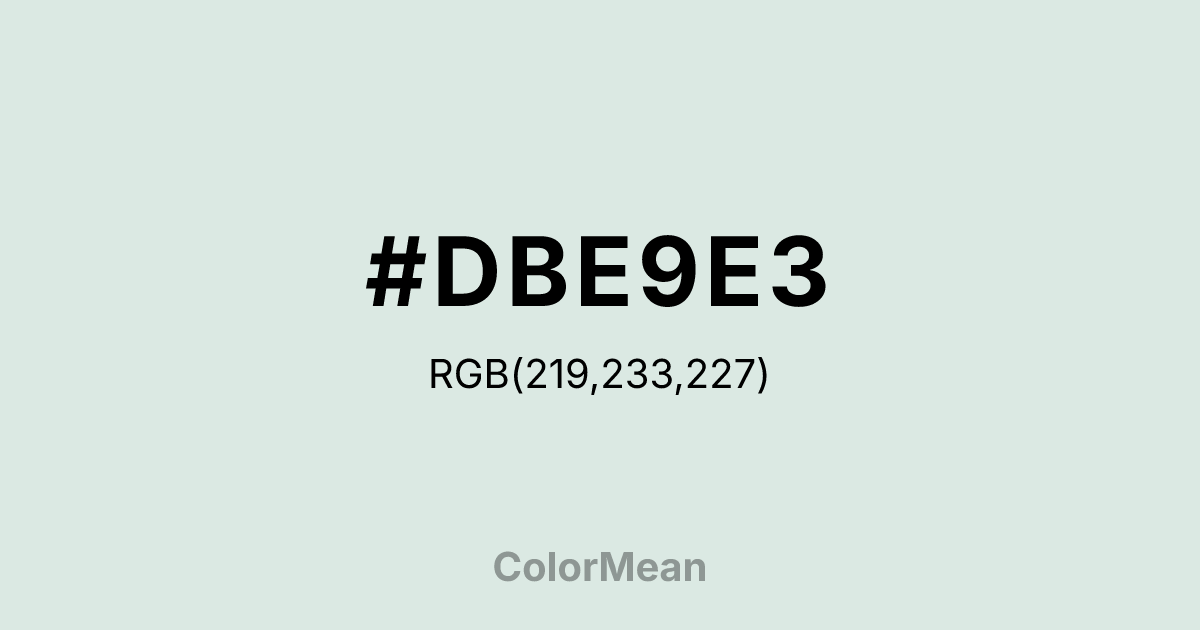 #DBE9E3 RGB value is (219, 233, 227). The hex color red value is 219, green is 233, and blue is 227. Its HSL format shows a hue of 154°, saturation of 24 percent, and lightness of 89 percent. The CMYK process values are 6 percent, 0 percent, 3 percent, 9 percent.