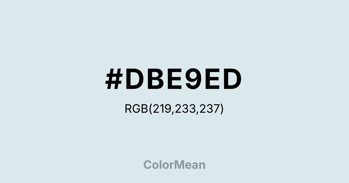 #DBE9ED RGB value is (219, 233, 237). The hex color red value is 219, green is 233, and blue is 237. Its HSL format shows a hue of 193°, saturation of 33 percent, and lightness of 89 percent. The CMYK process values are 8 percent, 2 percent, 0 percent, 7 percent.