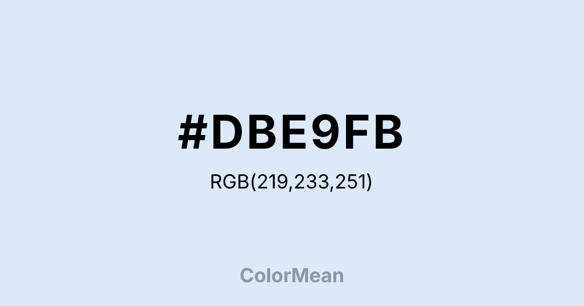 #DBE9FB RGB value is (219, 233, 251). The hex color red value is 219, green is 233, and blue is 251. Its HSL format shows a hue of 214°, saturation of 80 percent, and lightness of 92 percent. The CMYK process values are 13 percent, 7 percent, 0 percent, 2 percent.