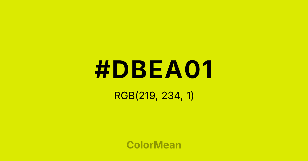 #DBEA01 RGB value is (219, 234, 1). The hex color red value is 219, green is 234, and blue is 1. Its HSL format shows a hue of 64°, saturation of 99 percent, and lightness of 46 percent. The CMYK process values are 6 percent, 0 percent, 100 percent, 8 percent.