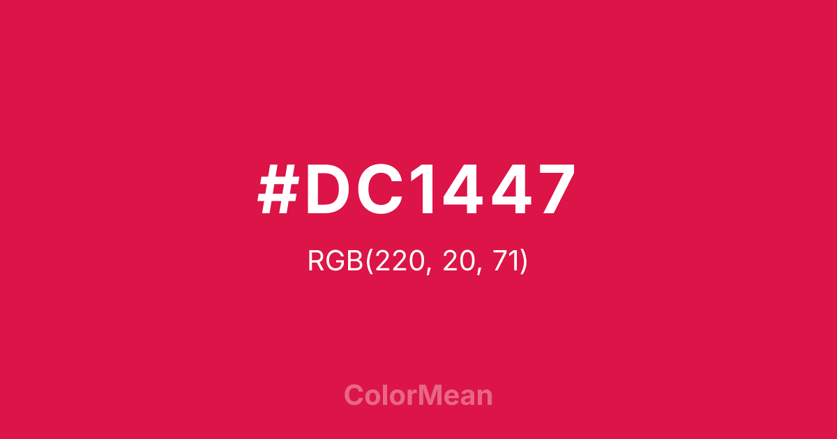 #DC1447 RGB value is (220, 20, 71). The hex color red value is 220, green is 20, and blue is 71. Its HSL format shows a hue of 345°, saturation of 83 percent, and lightness of 47 percent. The CMYK process values are 0 percent, 91 percent, 68 percent, 14 percent.